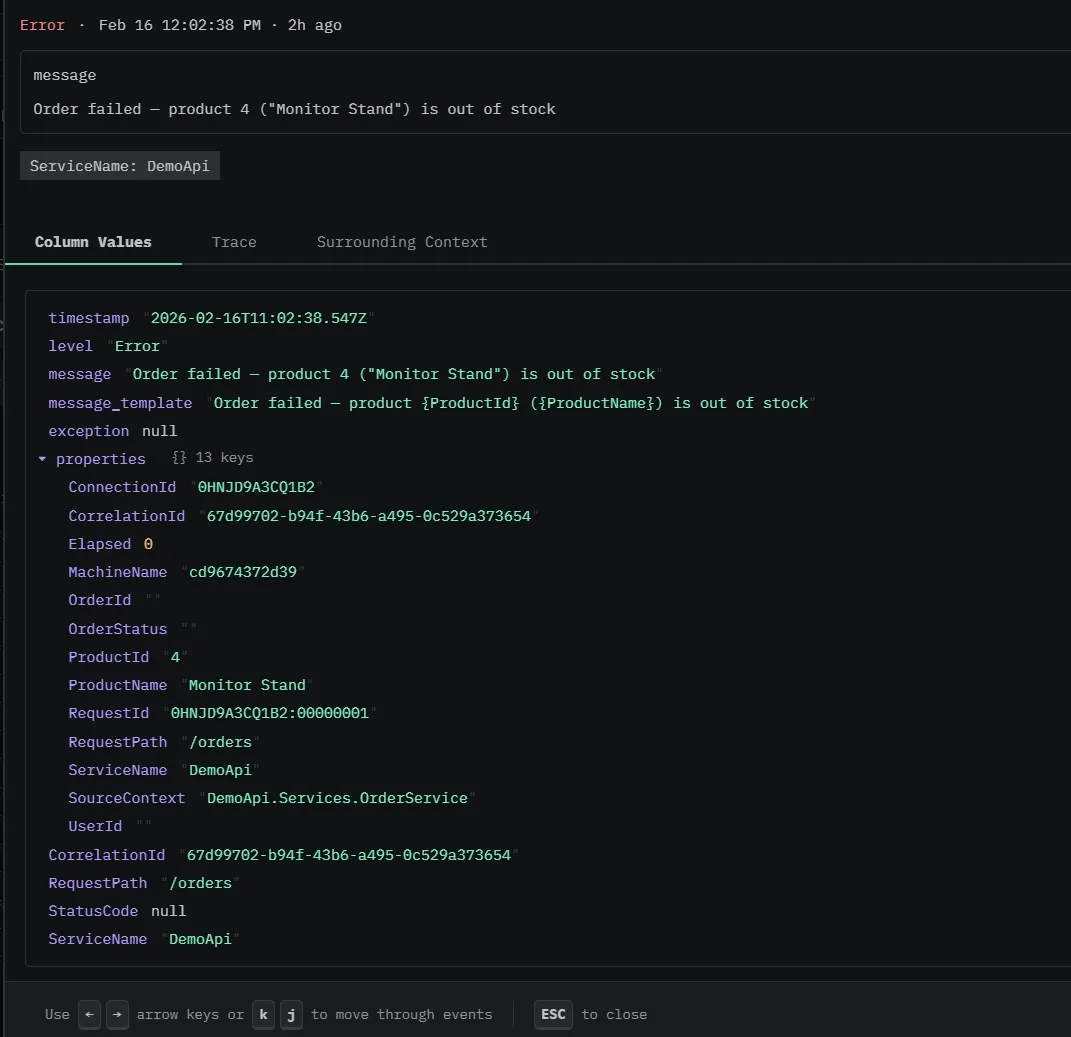 Our demo is a simple product catalog and ordering API with no separate database. It produces diverse log events across all log levels: