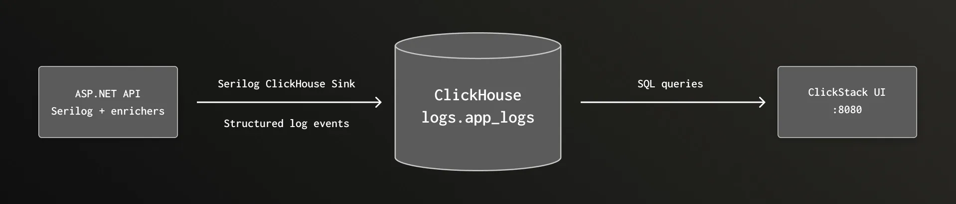 We've built a .NET service that produces structured log events via Serilog, writes them directly to ClickHouse, and lets us query our logs using SQL.