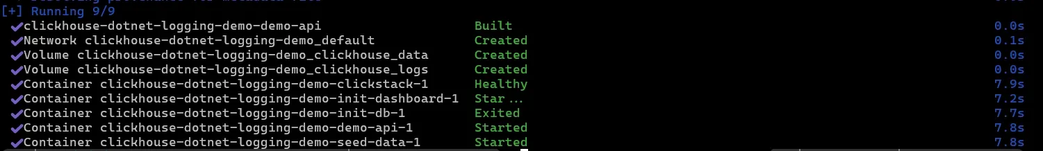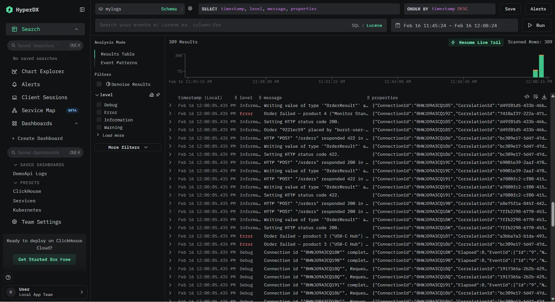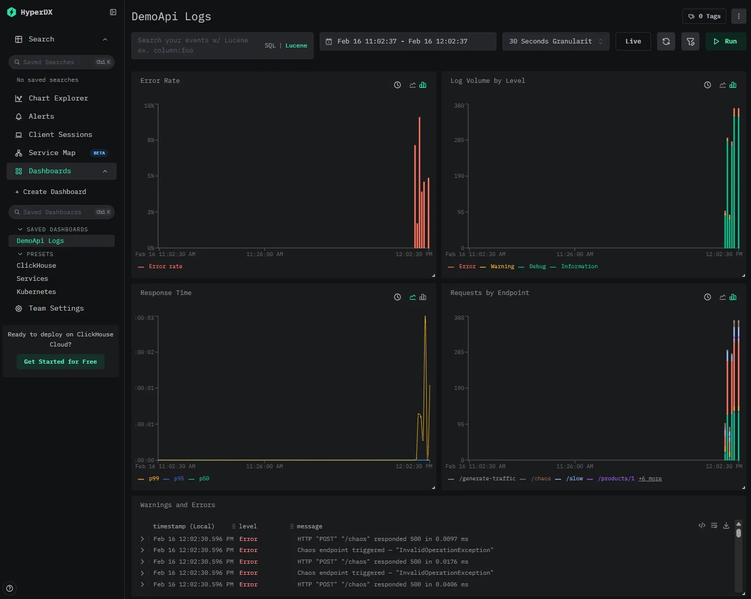 The entire demo runs with a single docker compose up. Clone the repo, generate some traffic, and see what structured logs look like in ClickHouse. When you're ready to try it with a managed deployment, get started with ClickHouse Cloud.