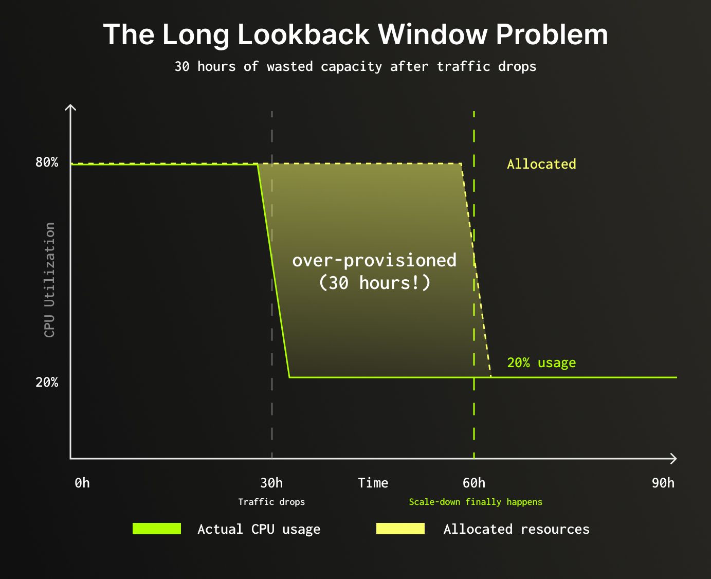 Our original auto-scaling system used a 30-hour lookback window to determine resource recommendations. This approach had clear benefits: