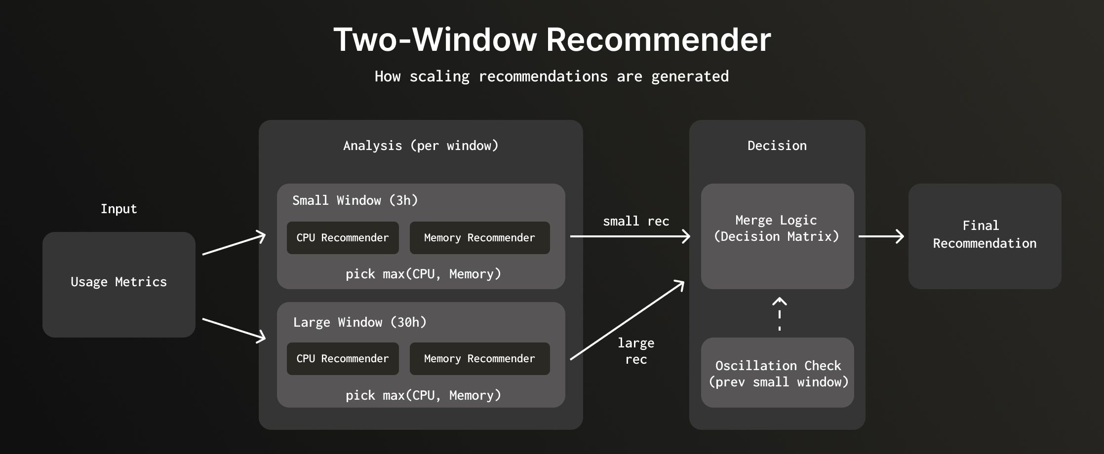 Each window independently generates a recommendation using both memory and CPU analysis. The system then merges these recommendations based on the scaling direction each window suggests.