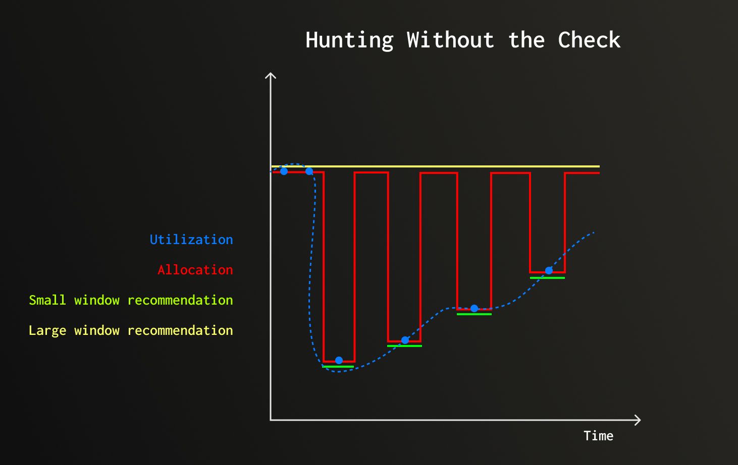 Illustrative example: After high CPU usage subsides, actual utilization (blue dots) drops then starts rising slowly. The large window (yellow) holds its recommendation steady. The small window (green) drops fast after the spike. Without the hunting check, the two-window merge logic would alternate between trusting each window, producing the red line, hunting between scale-down and scale-up. The hunting check prevents this by trusting the large window whenever the small window is trending upward.