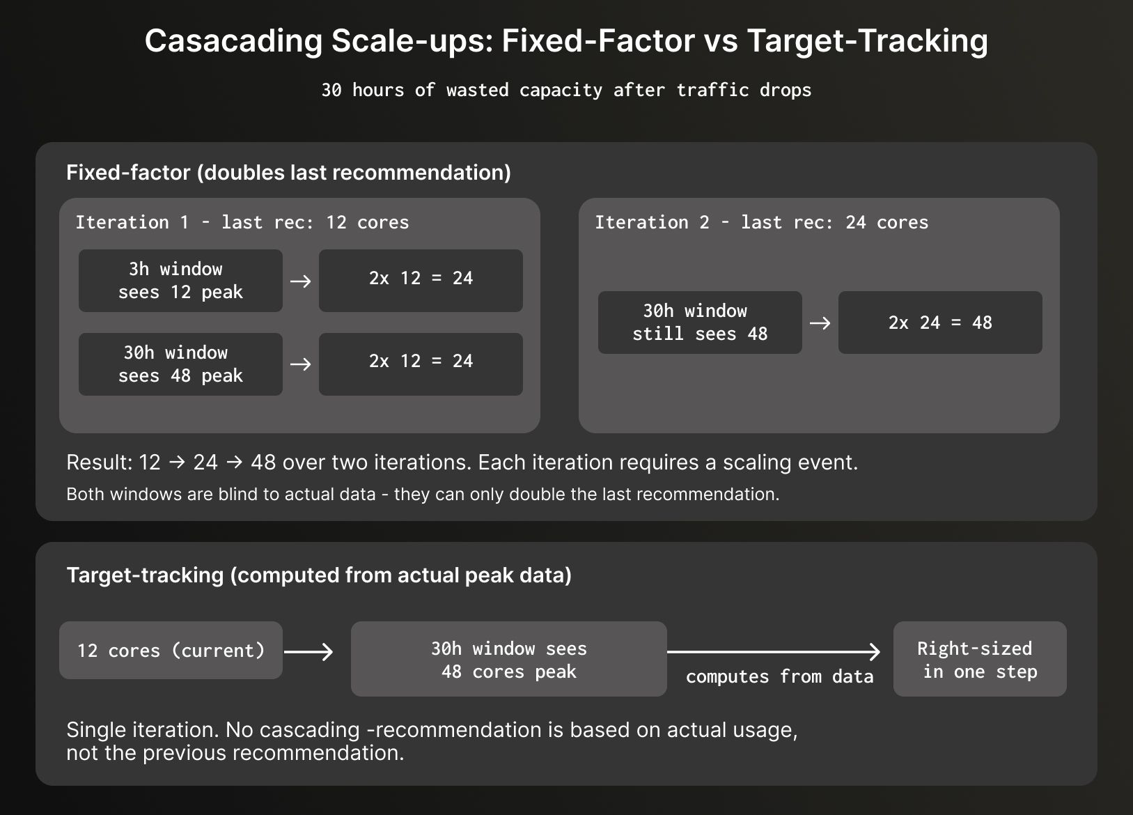 The fixed-factor algorithm could only double or halve the last recommendation; it couldn't calculate directly from the actual peak usage data. With two windows running in parallel, this meant even when the 30-hour window could see a large peak, it couldn't jump to the right size in one step.