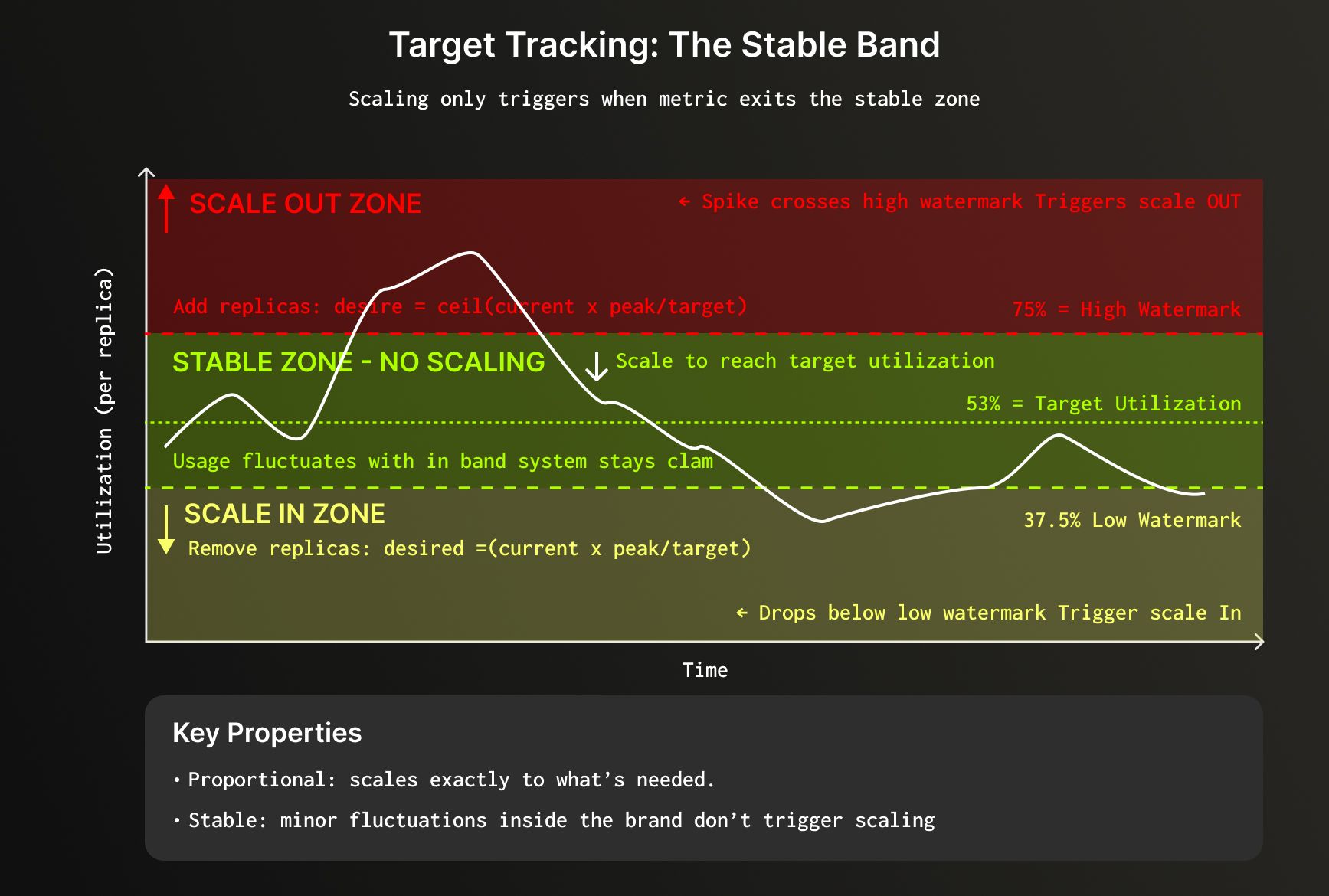 The algorithm scales to achieve target utilization, creating a stable band where usage can fluctuate around the target without triggering another scaling event. In our current implementation, target utilization is the geometric mean of the watermarks.