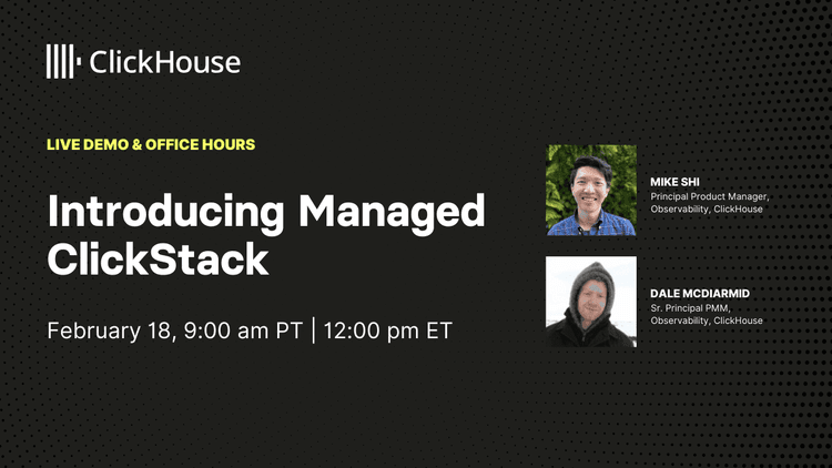 Join us for a live workshop where we go through the steps of how to start using ClickHouse Cloud. You’ll learn how to take your first steps with the service, including where to get help and guidance if you get stuck. We’ll also discuss what makes ClickHouse unique, how to get data into your ClickHouse service and what is typically done to tune performance and reduce costs. We will end with an open Q&A session where our experts are standing by.