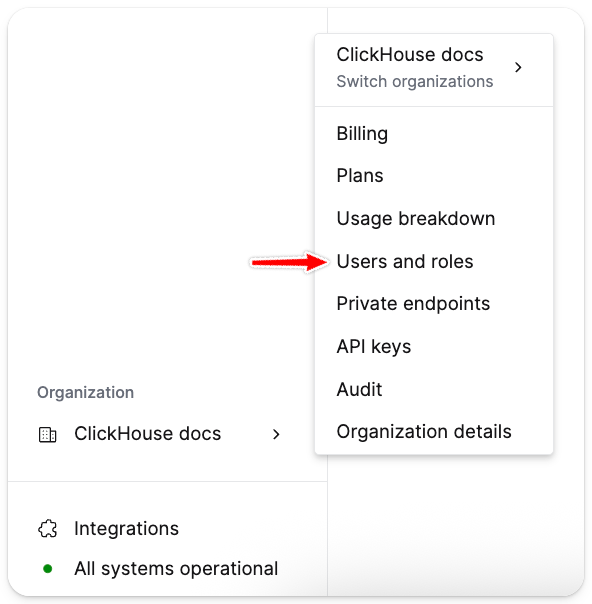 드롭다운 메뉴에서 항목을 선택하여 콘솔 전체 액세스 권한과 사용자가 ClickHouse 콘솔 내에서 이용할 수 있는 기능을 설정합니다. 역할과 해당 권한 목록은 Console roles and permissions을 참고하십시오.