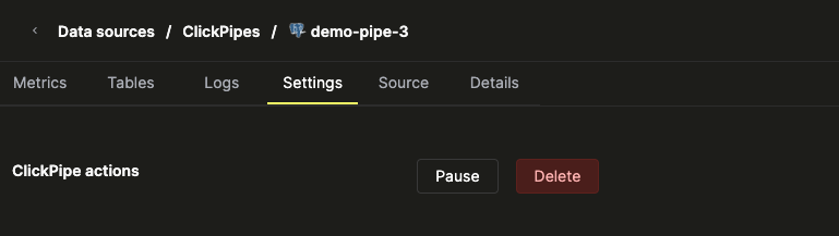 - Data Sources 탭에서 일시 중지할 Postgres ClickPipe를 클릭합니다.