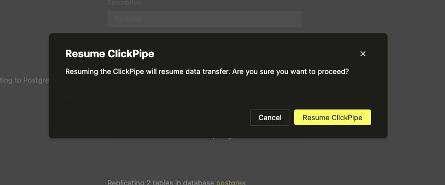 Postgres ClickPipe를 일시 중지하는 것이 유용한 상황이 있을 수 있습니다. 예를 들어, 정적인 상태의 기존 데이터에 대해 분석 작업을 수행해야 할 수도 있습니다. 또는 Postgres를 업그레이드하는 작업을 진행 중일 수도 있습니다. 다음은 Postgres ClickPipe를 일시 중지하고 다시 시작하는 방법입니다.