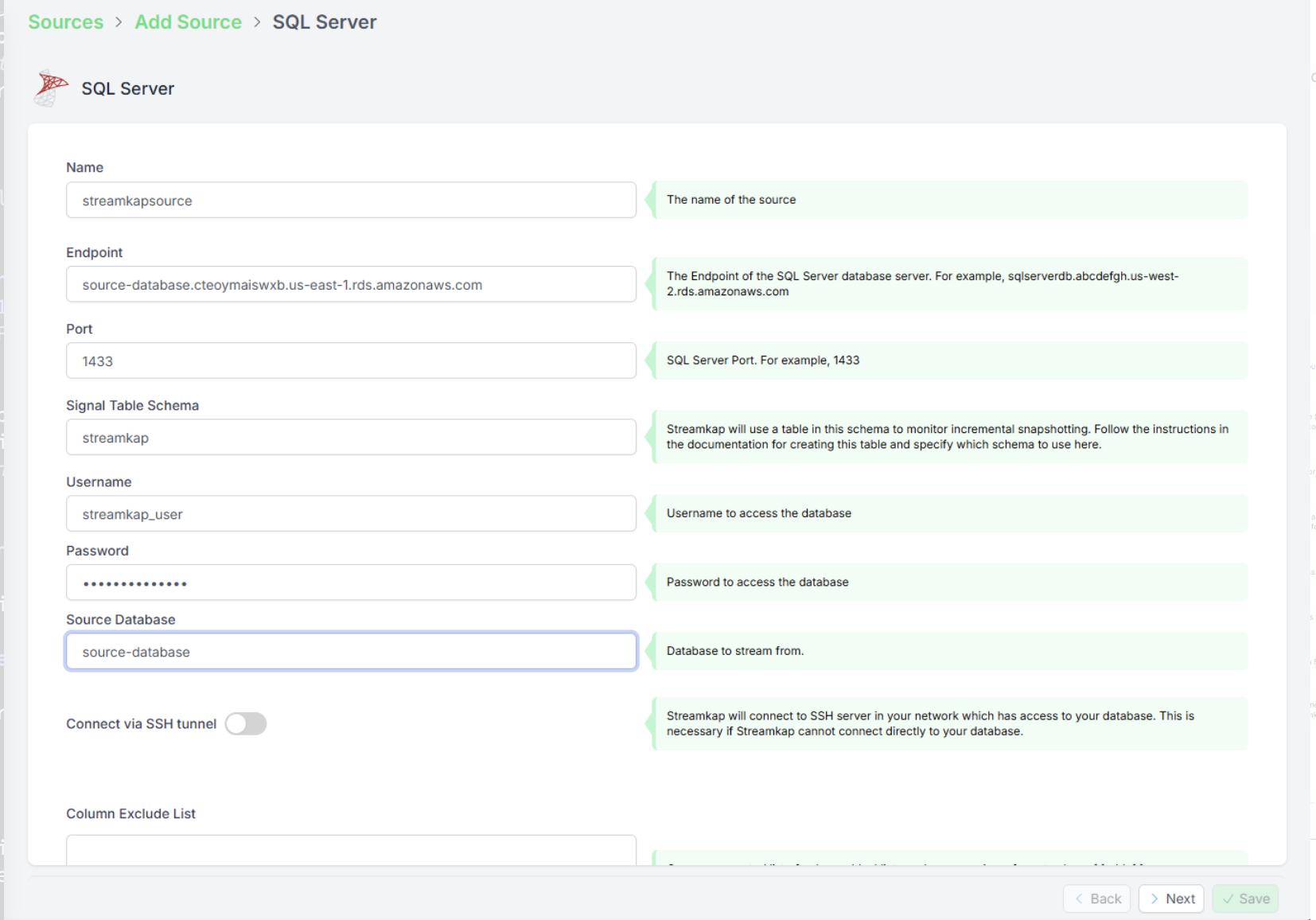 - SQL Server 서버 주소, 포트, 사용자 이름, 비밀번호. Streamkap이 SQL Server 데이터베이스에 접근할 수 있도록 별도의 사용자와 역할을 생성하는 것을 권장합니다. 구성 방법은 문서를 참고하십시오.